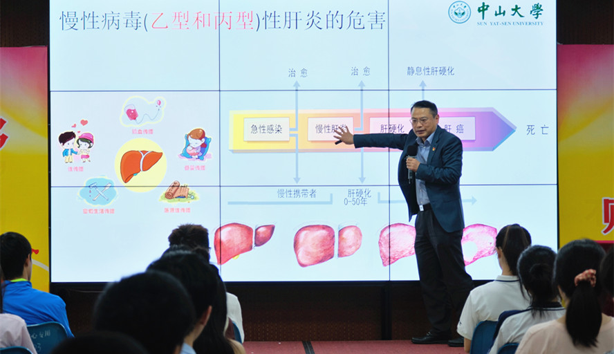本次活动包括讲座及义诊两项内容。中山三院感染科(肝内科)主任医师郑玉宝为师生带来题为“消除肝炎,防治肝硬化及肝癌/远离毒品防肝炎”的讲座,向同学们介绍了正常肝脏的生理功能、防治病毒性肝病和肝硬化等常见肝脏疾病的方法,同步进行禁毒科普培训。来自中山三院感染科(肝脏内科)、胃肠外科、神经内科、泌尿外科、消化科、儿科、检验科的医生在紫荆校道开展义诊活动,为师生排疑解惑。