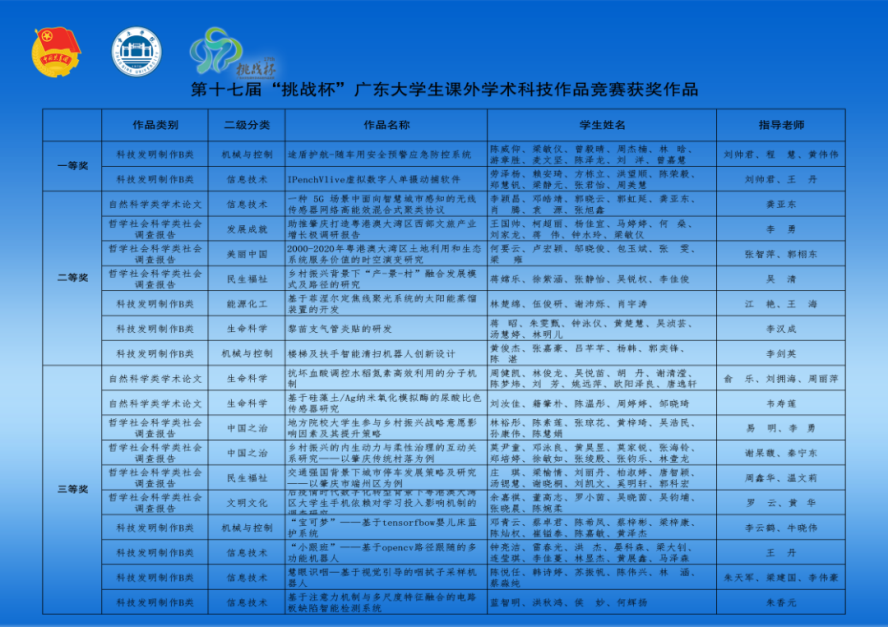 本网讯 5月27日至28日,由团省委、省教育厅、省科技厅、省科协、广东省社科院、省学联共同主办,中山大学承办的第十七届“挑战杯”广东大学生课外学术科技作品竞赛终审决赛在中山大学举行。我校共推荐23件作品进入省赛,其中9件作品进入省赛终审决赛,共获得一等奖2项,二等奖7项,三等奖10项的成绩。