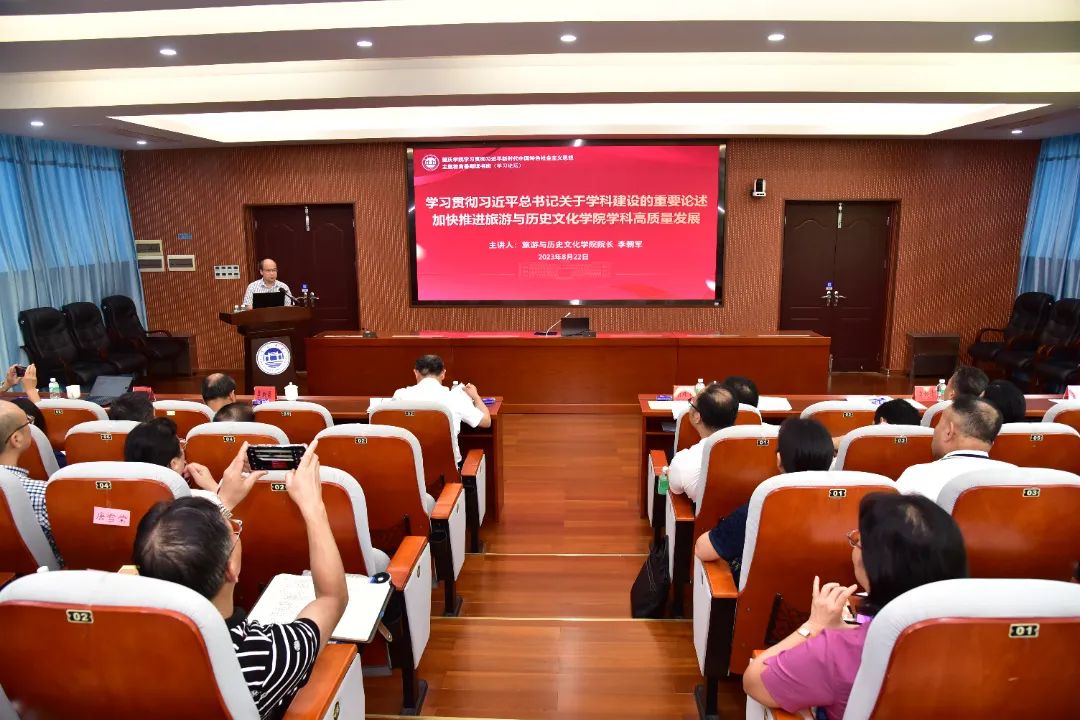 李朝军以“学习贯彻习近平总书记关于学科建设的重要论述 加快推进旅游与历史文化学院学科高质量发展”为主题作报告,结合经济社会发展对学科专业建设的需求,从旅游与历史文化学院学科建设基本现状,提出关于学科建设的路径思考以及保障措施。