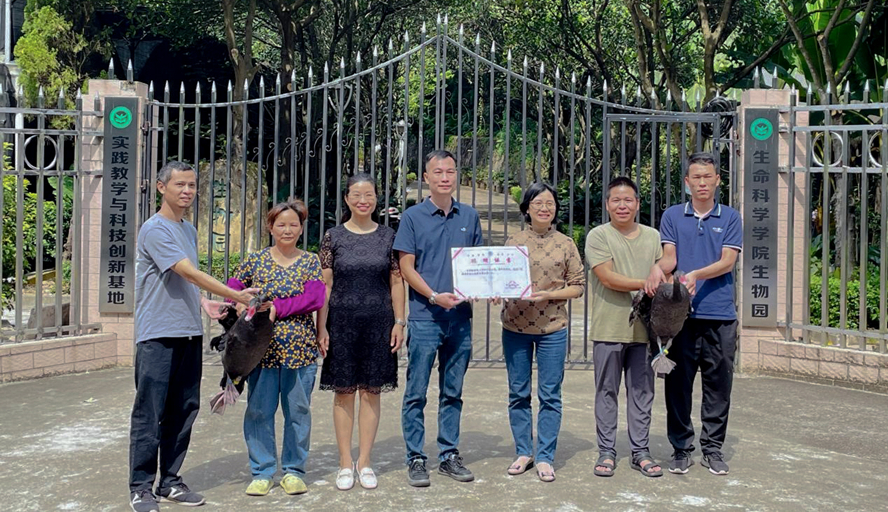 本网讯 10月17日,我校向广州美术学院赠送3只黑天鹅。赠送仪式在生物园举行,生命科学学院主持行政工作副院长邵玲、副院长李赛男,广州美术学院后勤处负责人参加。