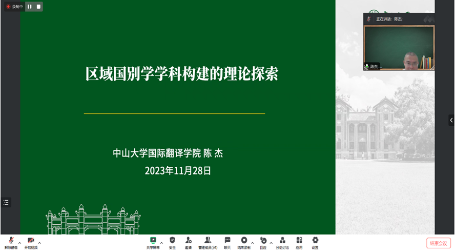 本网讯 11月28日,应我校区域国别研究中心邀请,中山大学国际翻译学院陈杰教授作了题为“区域国别学学科构建的理论探索”的讲座。讲座采取线上方式展开,副校长、中心主任胡文涛出席,外国语学院副院长、中心执行主任于增辉主持。中心成员及外国语学院教师40人参加讲座。