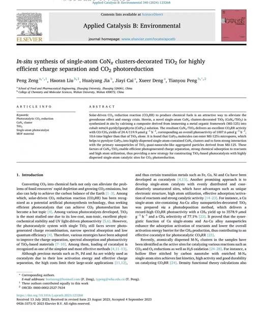 学校支持教师投身科研工作,发表高水平论文。曾鹏博士课题组在国际顶级期刊《Applied Catalysis B: Environmental》发表有关二氧化碳(CO2)光催化还原的研究论文,题为“In-situ synthesis of single-atom CoNx clusters-decorated TiO2 for highly efficient charge separation and CO2 photoreductio”(https://doi.org/10.1016/j.apcatb.2023.123268)。曾鹏为该论文的第一作者和通讯联系人,我校为第一完成单位,武汉大学为共同通讯单位。据了解,Applied Catalysis B: Environmental是中科院一区顶级期刊(催化领域影响因子IF仅次于 Nature Catalysis IF=37.8),2022年IF=22.1。