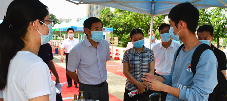 本网讯 5月18日是第一批毕业生返校的时间。当天上午,肇庆市副市长陈宣群来到我校,检查指导学生返校疫情防控工作,强调要以学生的健康安全为重,坚守岗位,落实责任,为学生返校提供健康安全保障。校长吴业春、校党委副书记谢冠华陪同检查。