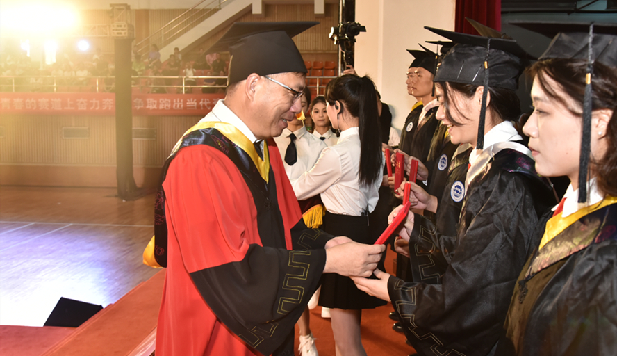 校长吴业春为各班毕业生代表、援藏援疆支教毕业生拨正学士帽流苏并颁发学士学位证书