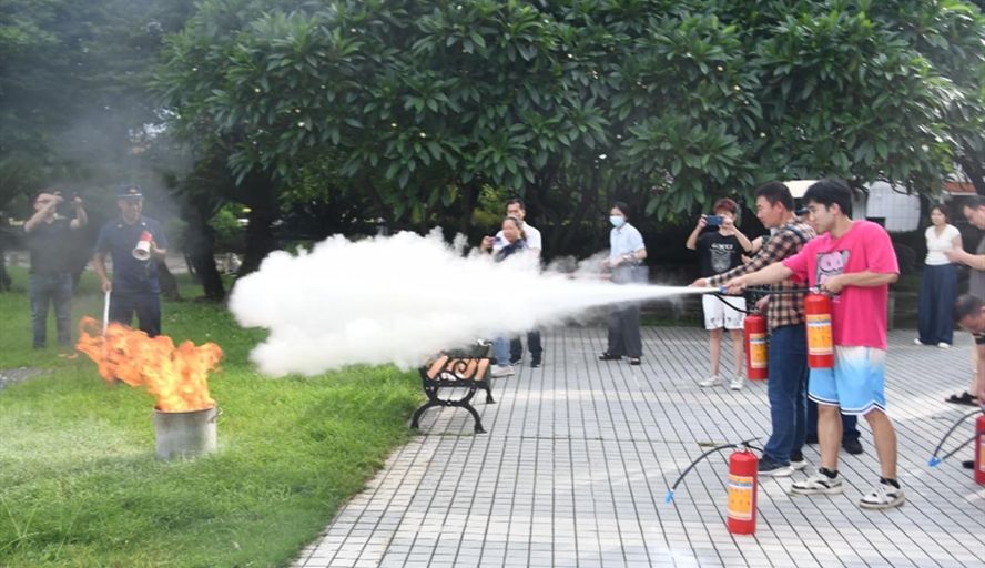 会后,参训人员在消防队员的指导下进行应急逃生演练,并实地体验消防设备操作。