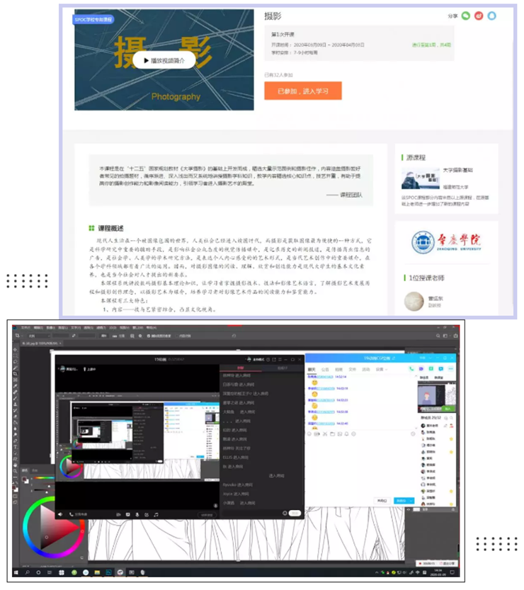 美术、音乐等术科学院,网络授课主要包括理论课和实践课两大方面,老师可根据专业特色选择平台。理论课老师会选择智慧树、雨课堂这些平台,专业技能课老师会选择可以面对面视频播放的平台,如腾讯会议、QQ群等,对学生进行网上一对多指导。音乐学院声乐教师郑以漩连续上了三节课,以小班上课形式,采用直播方式为学生做好发声示范,虽然不如面对面直接,但看到学生们学得很用心,她感到很欣慰。