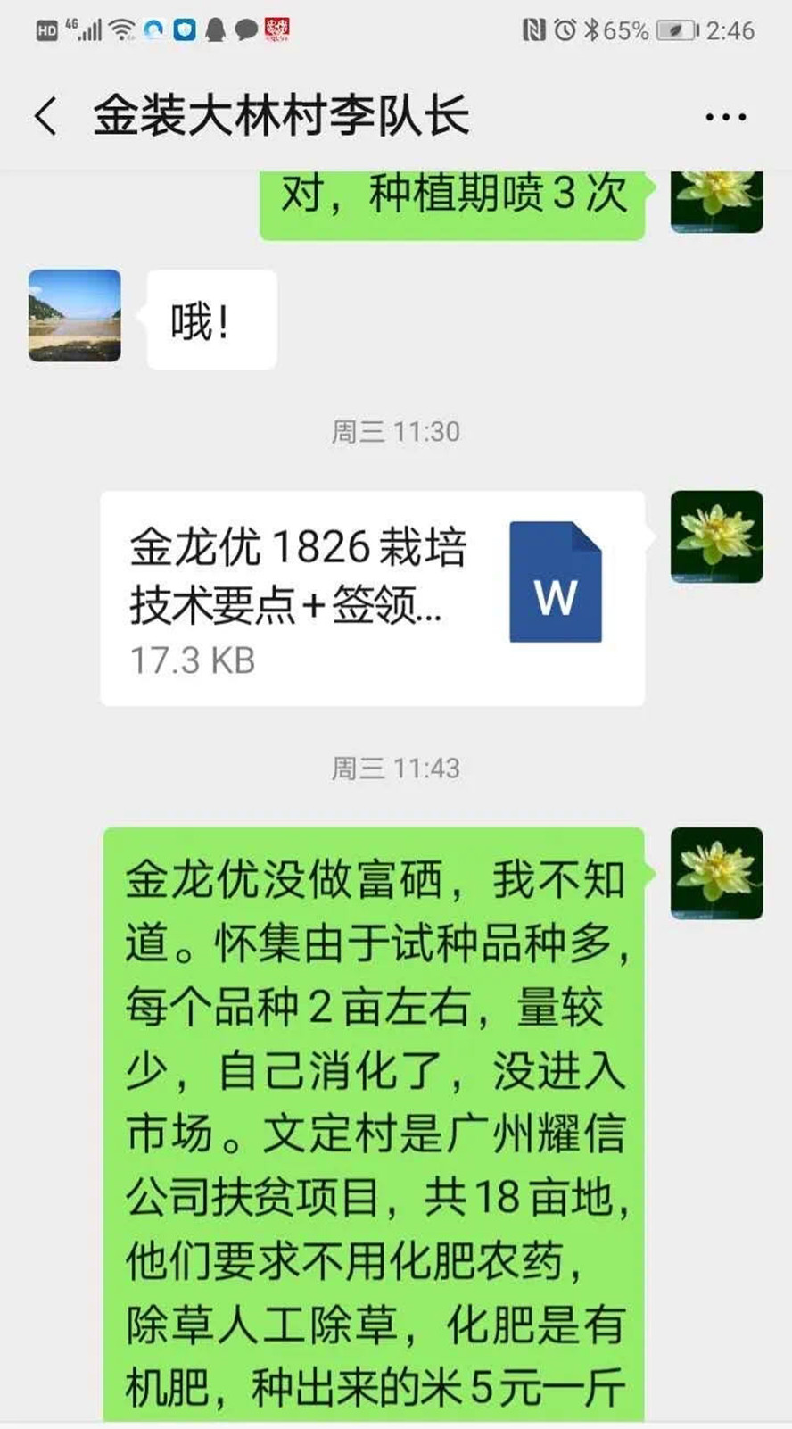 富硒技术团队通过微信及时发放富硒水稻种植的培训资料,并通过微信传发硒与免疫力、病毒感染和人体疾病的关系等知识。该团队带头人张宝杰教授在跟村民沟通时表示,人类跟疾病较量,最关键的地方还是提高人体免疫力,富硒农产品恰恰具有这样的辅助功能。得益于他的介绍,村民种植富硒水稻的热情大大提升。