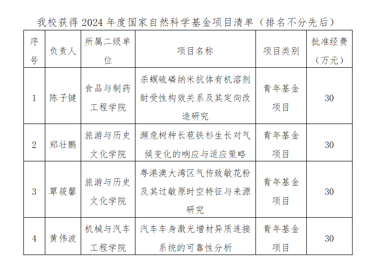 本网讯 近日,国家自然科学基金委员会公布了2024年度国家自然科学基金项目的评审结果,我校获批青年科学基金项目4项,直接经费共120万元。