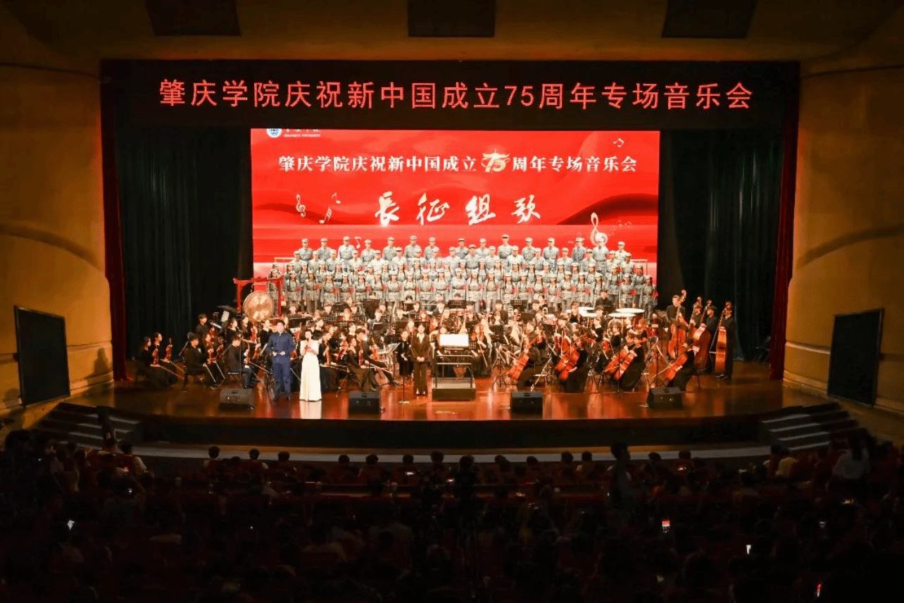 本网讯 9月28日,我校举办“长征组歌——肇庆学院庆祝新中国成立75周年专场音乐会”。校党委书记谢冠华、副书记欧洪湛、广东工业大学帮扶工作队队长刘怡军,肇庆市融媒体中心主任谢政,党委委员、宣传统战部部长陈前等领导出席,相关职能部门负责人、各二级党组织书记、全体辅导员、音乐学院师生代表、2024级新生代表近千余人参加。