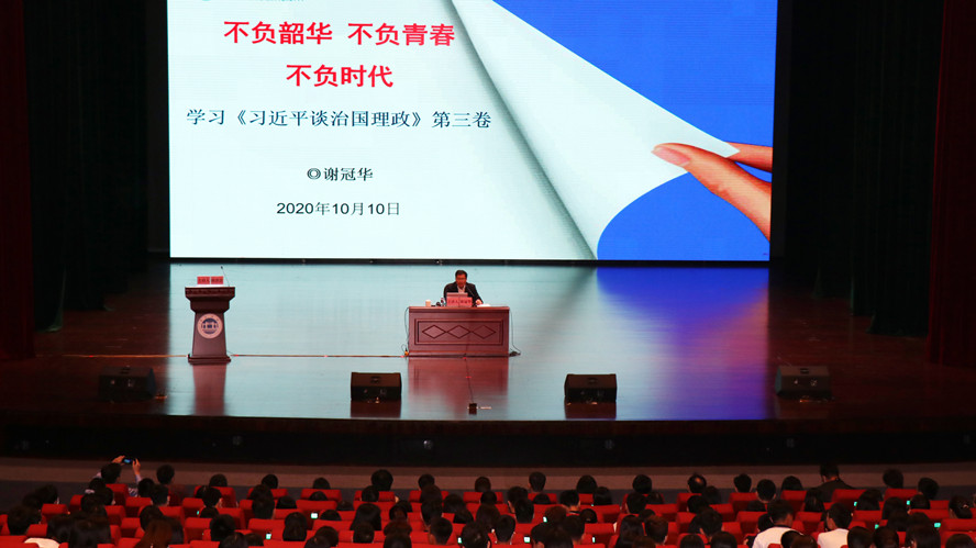 谢冠华作了题为《不负韶华 不负青春 不负时代——学习〈习近平谈治国理政〉第三卷》的专题辅导。他从《习近平谈治国理政》第三卷的时代背景、理论意义和实践意义,指导学员们学习《习近平谈治国理政》第三卷的精髓要义;从习近平总书记给青年大学生的四封回信,鼓励大家勇做走在时代前列的奋斗者、开拓者;从中华传统优秀文化,激励大家不断增强文化自信。他要求广大青年师生党员发展对象要树立远大理想,热爱伟大祖国,担当时代责任,勇于砥砺奋斗,炼就过硬本领,锤炼品德修为,争当新时代的中国好青年。