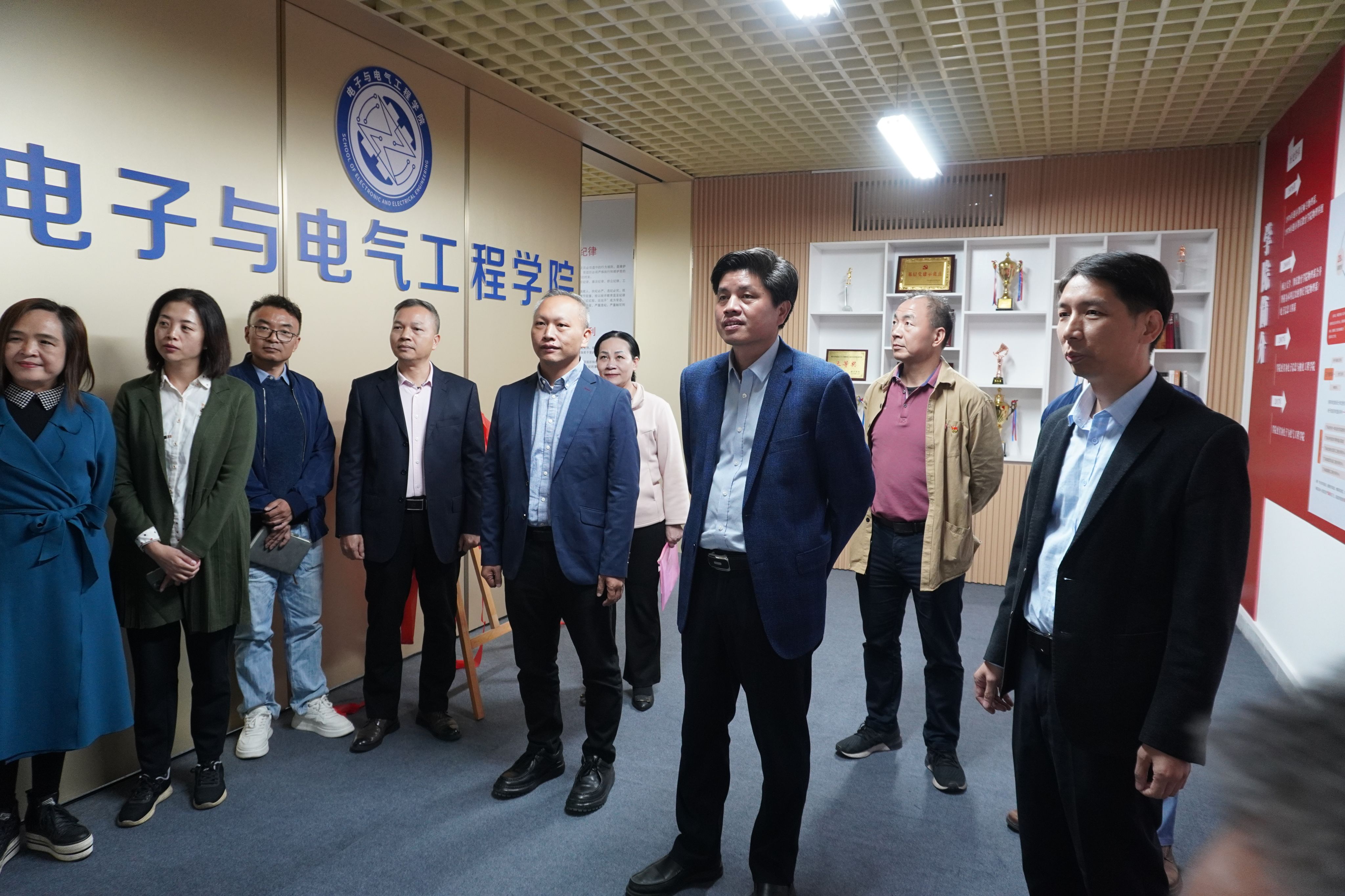 揭牌仪式上,欧洪湛对电子与电气工程学院“党建空间”&“职工小家”&“强师工程教师培训工作站”建成启用表示热烈祝贺。他指出,“党建空间”充分利用学院有限的活动场地,综合考虑各工作需要而建,兼顾各方面用途,总体布局合理,整体效果良好,对于有效展示学院办学成果、提升学院形象、丰富师生业余生活、凝聚师生力量均有着重要意义。他希望电子学院充分利用好“党建空间”,进一步夯实基层党组织,深化教育教学改革,强化师资队伍建设,团结带领全体师生员工,加快建设粤港澳大湾区高水平理工类人才培养高地。