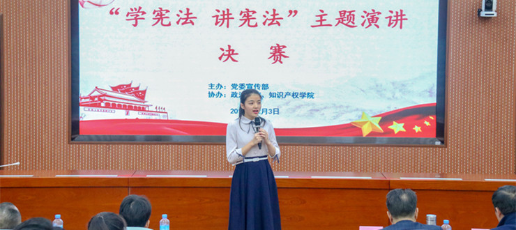 由党委宣传部主办,政法学院、知识产权学院协办的“学宪法 讲宪法”主题演讲比赛当天举行。经过此前预赛的角逐,18名选手脱颖而出进入决赛,其中非专业组14名,专业组4名。决赛现场,各选手结合典型案例,围绕“宪法与国家”“宪法与社会”“宪法与个人”三个主题,讲述发生关于宪法的故事,阐释他们对宪法的理解,表达维护宪法、遵守宪法、敬畏宪法,共同建设文明法治中国的理想和决心。最后,来自政法学院、知识产权学院的陈野菁、刘瀚泽分别斩获非专业组和专业组的第一名。