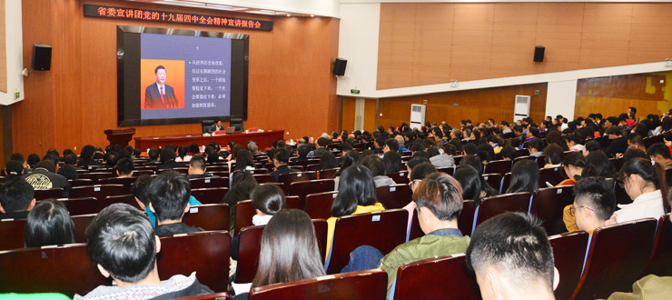 本网讯 12月5日,我校根据“不忘初心、牢记使命”主题教育的安排,召开党的十九届四中全会精神宣讲报告会,邀请省委宣讲团成员、省委宣传部副部长杜新山作宣讲报告,教育引导广大党员干部和全体师生把思想和行动统一到全会精神上来,锐意进取,奋发有为,推动全会精神在我校办学工作中落地生根。