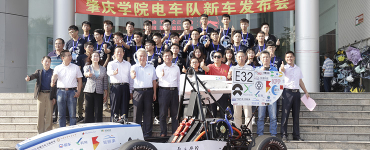 谢冠华和王忠为电动方程式赛车揭幕,与赛车队成员合影留念。