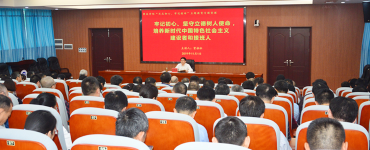 本网讯 11月1日,根据“不忘初心、牢记使命”主题教育的安排,校党委书记曾桓松以《牢记初心,坚守立德树人使命,培养新时代中国特色社会主义建设者和接班人》为题,上了一堂生动的党课。校领导、中层干部和主题教育办各工作组组长出席。