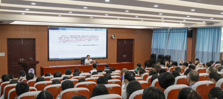 谢冠华首先介绍习近平总书记对于高等教育的论述,从教育方向、教育本质、教育战略、教育动力等方面进行了分析。随后,他围绕高校党建和思政工作开讲,表示要坚持党对教育的全面领导,进一步提升高校党的建设水平,以习近平新时代中国特色社会主义思想铸魂育人,坚持把立德树人作为根本任务,坚持优先发展教育不动摇,坚持社会主义办学方向,坚持以人民为中心的发展思想,坚持把服务经济社会发展作为重要使命,提升高等教育的贡献力,积极推动粤港澳大湾区教育合作发展,建设一支高质量专业化创新型教师队伍。接下来,谢冠华分析了现代大学发展的各种形态和学校的治理与文化塑造,指出我校要担当好现代大学的基本职能,坚持人才培养、科学研究、服务社会、文化传承创新“四位一体”发展定位,坚持全面推进特色鲜明的高水平应用型综合大学建设、全面深化体制机制改革、全面依法治校、全面加强党的领导“四个全面”发展战略,坚持价值塑造、知识探究、能力培养“三位一体”人才培养理念,扎实做好各项工作,促进我校综合发展和全面提升,为地方经济社会发展输送德智体全面发展的优秀人才。