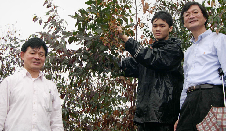 图为梁广坚与加拿大教授一起带学生到山地研究植物抗寒性 左一为梁广坚