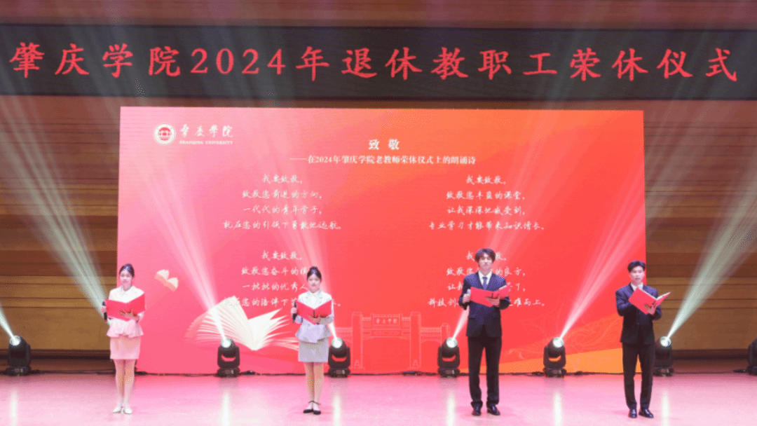 音乐学院舞蹈团带来舞蹈表演《季》。如同教育者的生涯写照,舞者们凭借精湛的技艺和细腻的情感表达,配合着恰到好处的舞美设计,展现了教育者于岁月的舞台上,由青涩到成熟、从耕耘到收获,循环往复、生生不息的生命律动。文学与传媒学院、团委学生带来朗诵表演《致敬》。真挚的情感、激昂的语调、声音起伏张弛有度,观众们沉浸其中。《致敬》宛如一首对教育工作者的赞歌,激昂的语调恰似对教育者数十年如一日坚守讲台的歌颂,起伏的节奏如同对教育者在平凡日子里无私奉献的礼赞。来自音乐学院的史歌老师带来独唱表演《长大后我就成了你》。演唱者以动人歌喉、凭真诚歌词将对荣休教师辛勤教诲的感激之情借歌曲徐徐流入观众们的心中,“小时候”与“长大后”相互联系展现教育工作者长久扎根教育领域无私付出的同时,也将新旧两代教育工作者的传承情怀跃然歌声之上。肇庆学院合唱团带来合唱表演《如愿》,以歌词中雾中明灯、天空星火等意象将无数教师无私高尚的引领作用具象化,传唱着教育工作者,用音乐将对荣休教师的拳拳热切交杂于声线之间。
