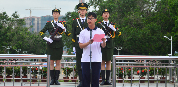 当天上午7:10,仪式准时开始。在全场目光的注视下,国旗护卫队迈着矫健的步伐走上升旗台,做好升旗准备。伴随着雄壮的国歌旋律,鲜艳的五星红旗冉冉升起。这时候,全场师生高唱国歌,致敬伟大的祖国。