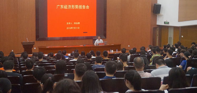 陈金德从2018年我国我省经济发展形势回顾,2019年第一季度经济发展走向,贯彻落实习近平总书记对广东重要讲话和指示精神,做好全省下一步工作等方面进行讲解。陈金德指出,2018年及2019年第一季度我国、我省经济发展稳中有进,开局良好,但是当前国内和省内经济仍存在区域协调发展不平衡、区域创新资源分布不合理等问题,要以习近平新时代中国特色社会主义思想为指导,对下一阶段经济社会发展进行更加科学合理的布局谋篇。对于我们广东而言,要以建设粤港澳大湾区为契机,通过实施创新驱动发展战略等举措,全面提升经济发展质量,践行好总书记对广东经济发展的殷切期望,努力实现“四个走在全国前列”,当好“两个重要窗口”。