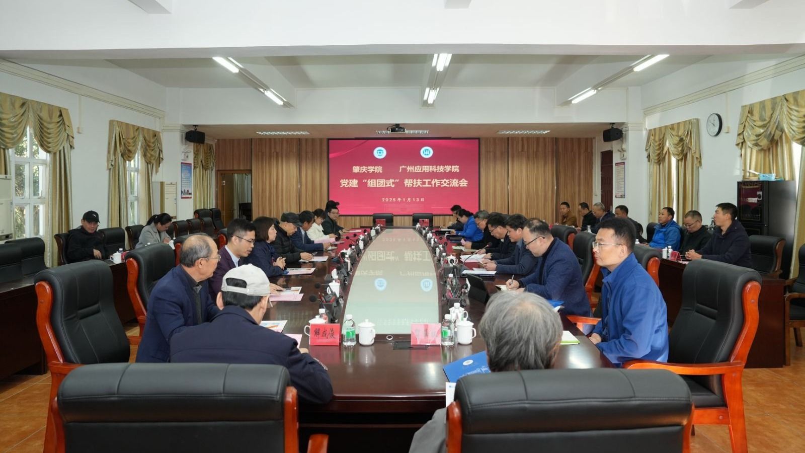 本网讯 1月13日,我校与广州应用科技学院召开党建“组团式”帮扶工作交流会,并签订联合培养硕士研究生协议。学校党委书记谢冠华,广州应用科技学院执行校长张光宇,党委书记、督导专员陈光团,党委副书记、纪委书记、副校长刘志新,校长助理、党委教师工作部部长、人事处处长李根珍,党委委员、组织部部长、统战部部长陈贤明,党委委员、宣传部部长李帆参加会议。学校党委副书记欧洪湛主持会议,副校长胡文涛,党委委员、宣传统战部部长、党政办公室主任陈前出席会议。