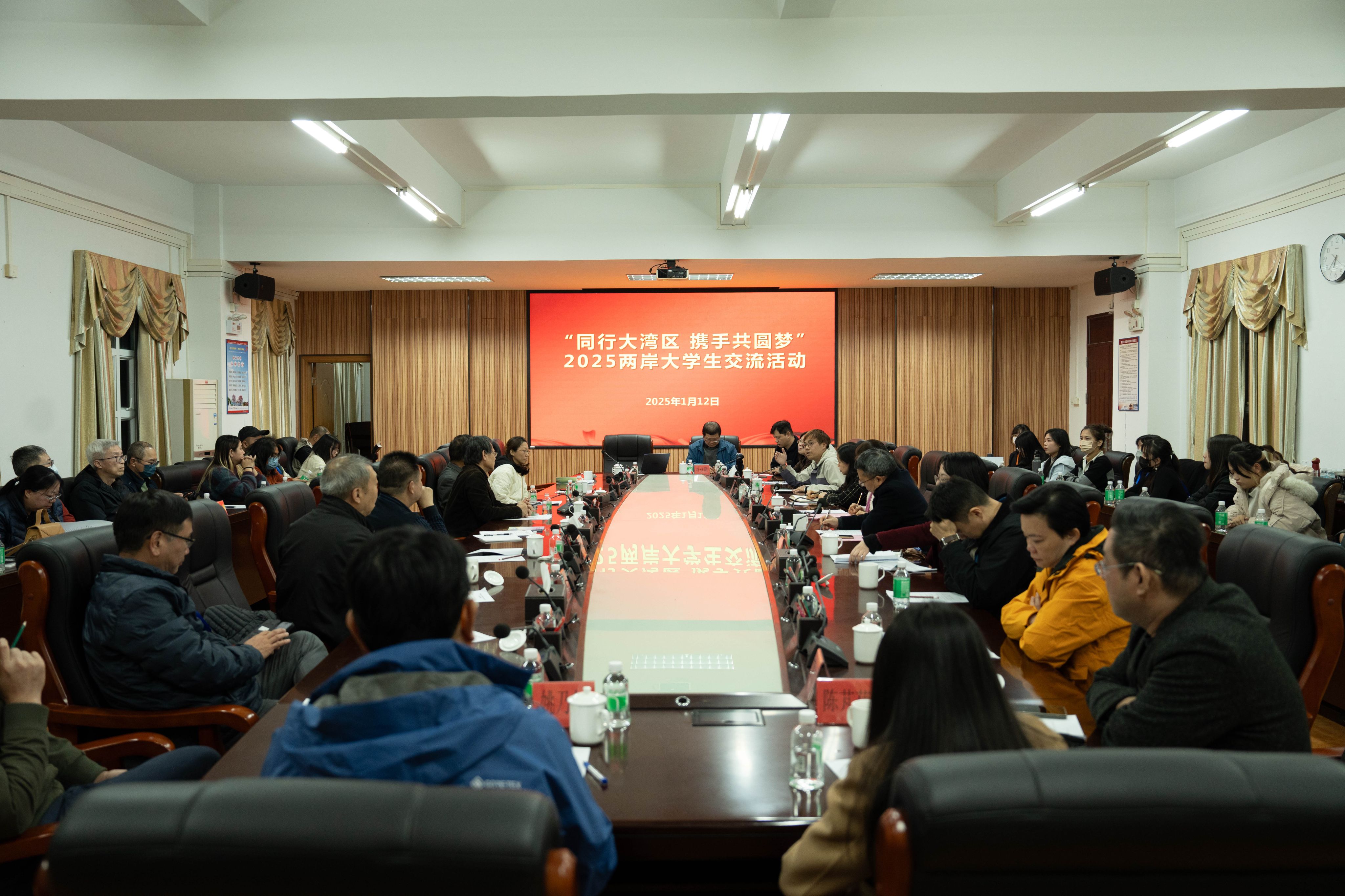 本网讯 1月12日,“同行大湾区 携手共圆梦”2025两岸大学生交流部分活动在我校顺利举行。来自台湾台东大学等学校的师生及省市相关工作人员一行40余人莅临我校参访并座谈交流。我校胡文涛副校长参加座谈会并致辞。学校相关职能部门负责人、台湾教师代表等参加活动。座谈会由港澳台与外事工作部部长李赛男主持。
