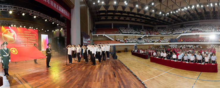 本报讯 5月19日,我校纪念五四运动100周年特别主题团日活动在体育馆隆重举行。活动以“青春心向党,建功新时代”为主题,引领师生深入学习贯彻习近平总书记在纪念五四运动100周年大会上的讲话精神,传承和弘扬以“爱国、进步、民主、科学”为核心的五四精神,刻苦学习,努力工作,为实现中华民族伟大复兴的“中国梦”贡献力量。