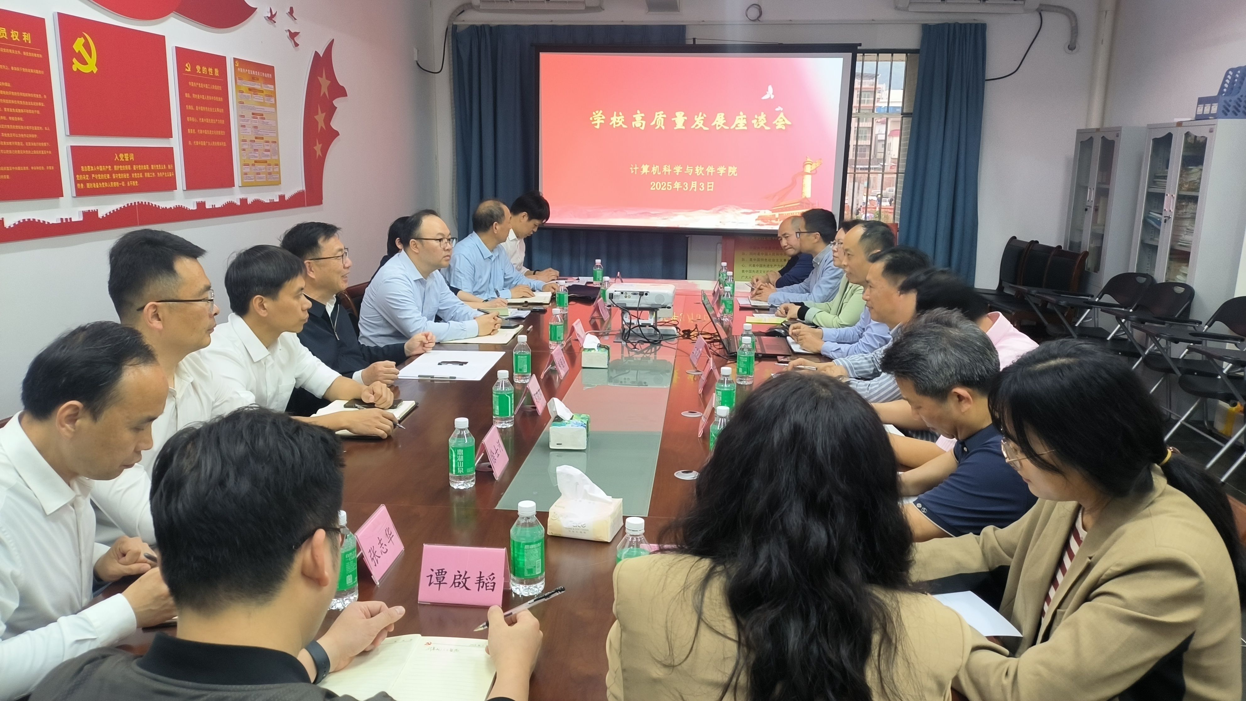 本网讯 3月3日,新学期开学第一天,学校党委书记谢冠华带领人力资源部、教务部、科学技术部、发展规划部、资产设备管理部、现代教育技术中心等部门负责人走访计算机科学与软件学院,并召开学校高质量发展座谈会。学院党政班子成员、专业负责人、部分骨干教师参会,学院党委书记黎天宇主持会议。