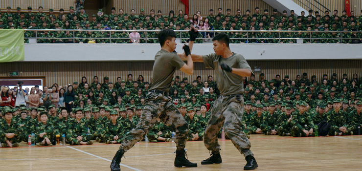 新任学生教官展示了示范军训动作、格斗术与匕首操,经过数月的专门技能训练,他们威武的身姿和健硕的体魄赢得一片喝彩。