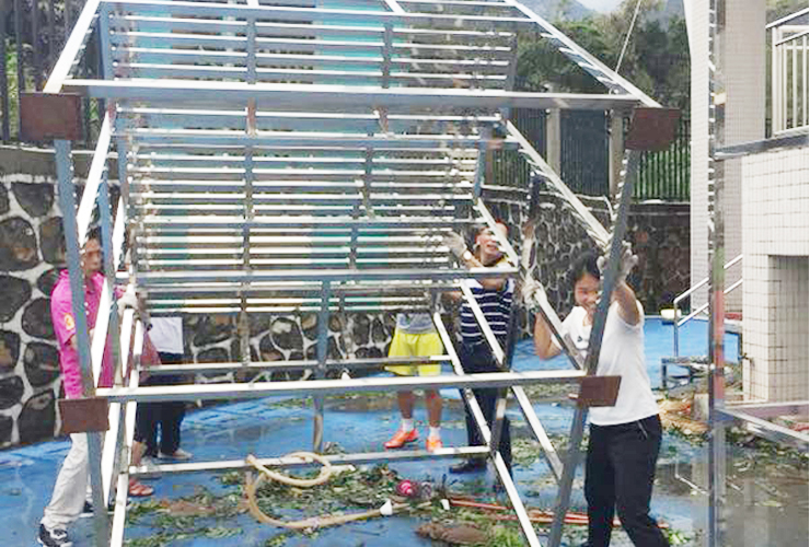 场馆中心人员扶起倾覆的铁架
