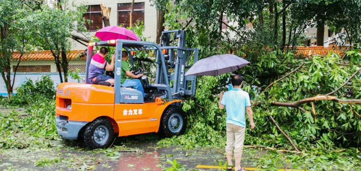 后勤员工在清理吹倒的树木