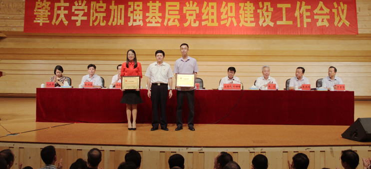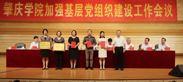 大会上,广东省高校“三型”党支部、肇庆市直工委2018年“七一”表彰先进集体及个人、肇庆学院首批“双带头人”教师党支部书记工作室、肇庆学院2018年基层党建示范点创建单位接受颁奖和授牌。