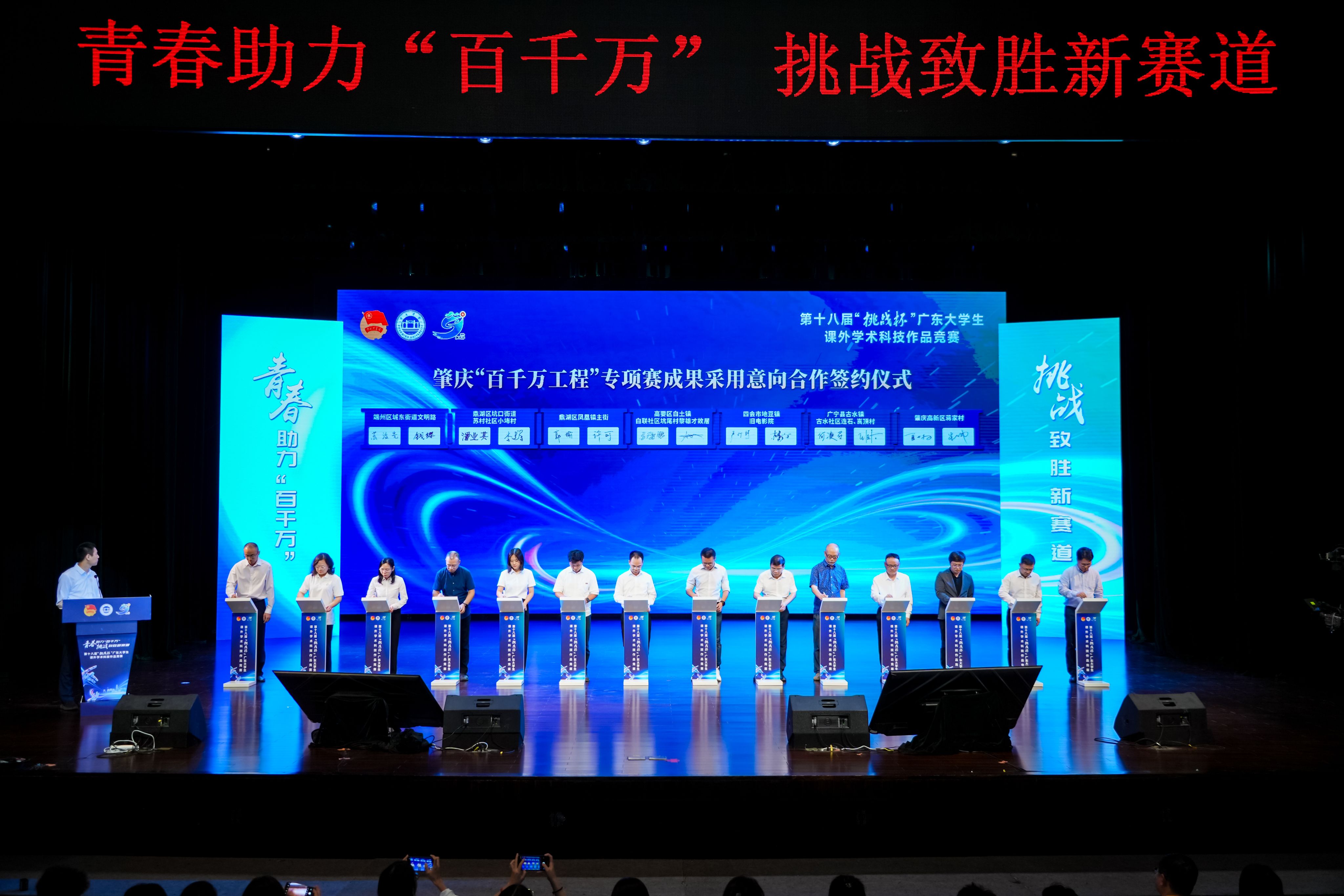 肇庆市端州区、鼎湖区、高要区、四会市、广宁县、高新区“百千万工程”指挥办代表与7个案例点位特等奖获奖团队代表共同签署专项赛成果合作意向书。