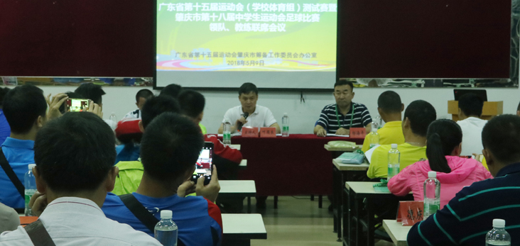 又讯 5月9日晚,广东省第十五届运动会(学校体育组)测试赛暨肇庆市第十八届中学生运动会足球比赛裁判长、领队、教练员及技术代表联席会议在我校召开。会议就本次足球赛的比赛场地进行了抽签。体育与健康学院院长杨海平,市体育局有关领导,各参赛运动队领队、教练员、裁判员出席了会议。