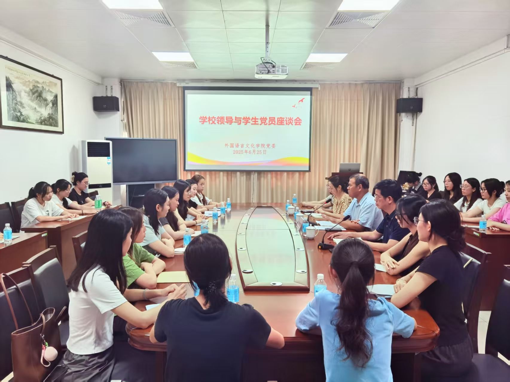 本网讯 6月25日,副校长李新昌与外国语言文化学院2025届毕业生党员们亲切座谈,勉励他们不负青春韶华,以奋斗之姿书写人生华章。学院党委书记卢咏、党委副书记杨琼参加座谈。