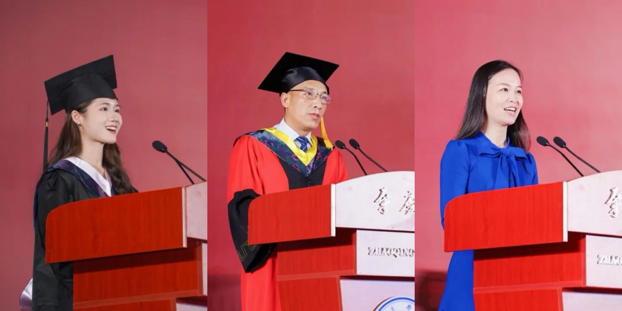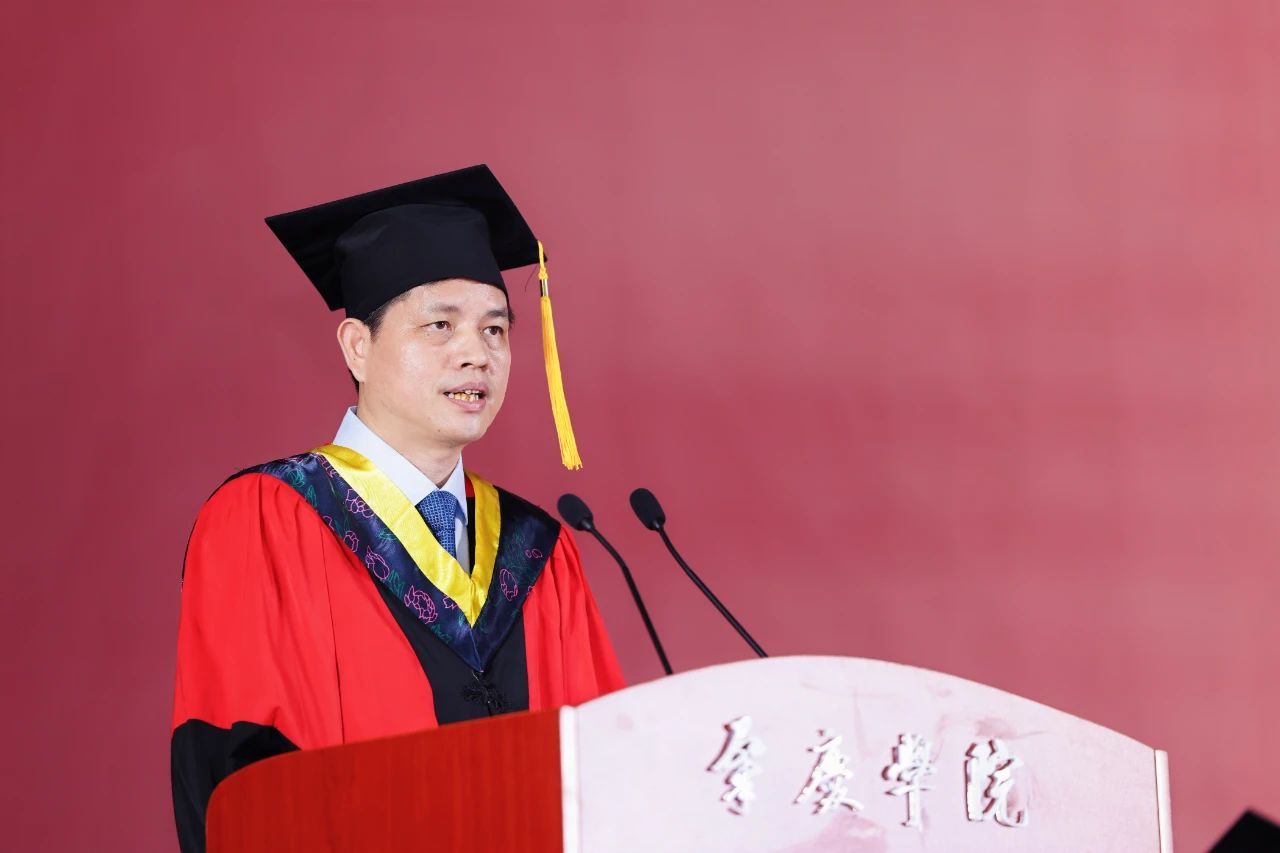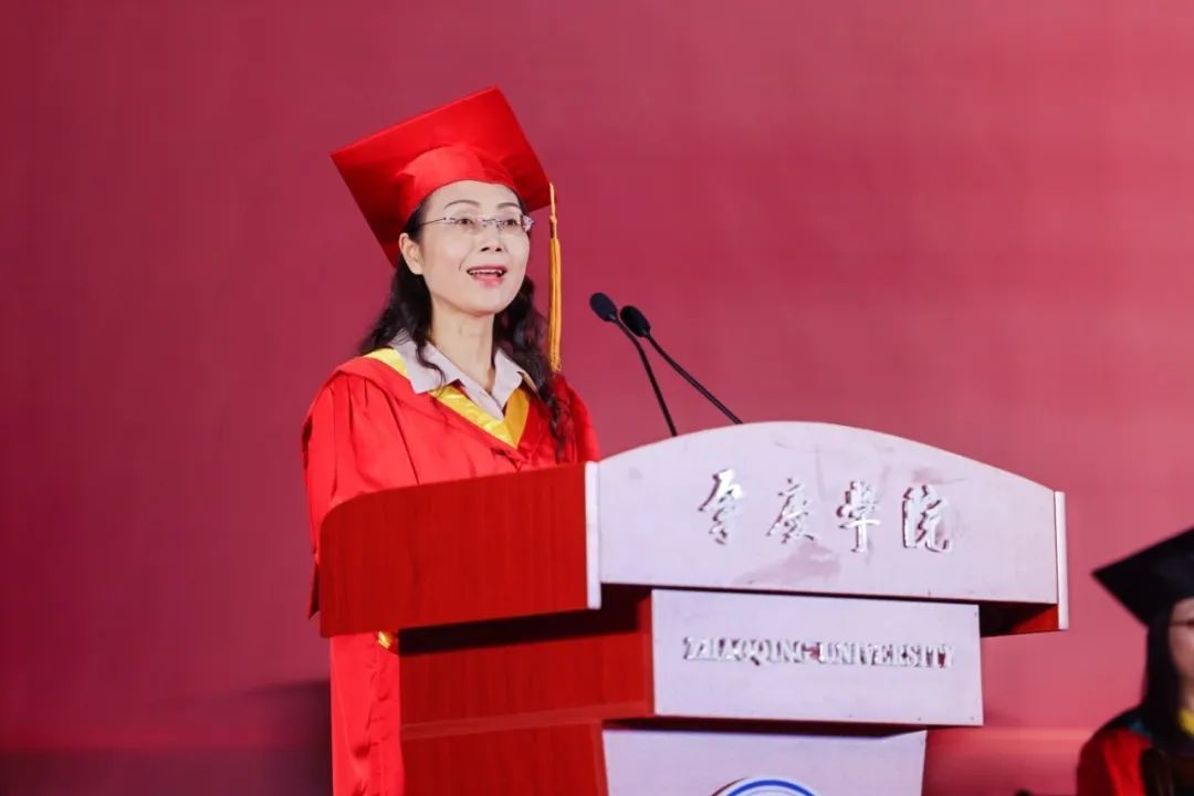 “要以厚德为基、以明智为灯、以博学为翼、以力行为本。”毕业生代表、文学与传媒学院本科生吴培桦表示,将带着母校赋予的底气,做知行合一的践行者,做砚园精神的传承者,做新时代的破题者。“每一次跨越,都是成长。每一次抵达,都是重新出发。”教师代表、经济与管理学院李华军勉励即将毕业的砚园学子,要充满敢做善为的干劲,保持乱云飞渡的从容,拥有欲穷千里的志向。“离校后,母校的关怀、祝福从未断线。恩师的指点、同窗的鼓励、砚园人的自信,都是我的加油站。”校友代表、2008届音乐学专业毕业生、肇庆市颂德学校校长梁瑞芳将心中的“热爱”与“执着”娓娓道来,向站在新坐标上的毕业生们分享自己的心得。