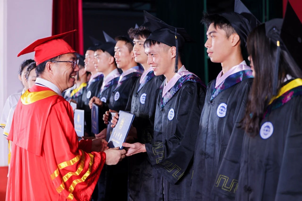 仪式上,谢冠华为优秀毕业生代表、退役士兵和国旗护卫队代表颁发证书、为毕业生校友工作联络员颁发聘书;李琴为获得学士学位的学生代表拨正学位帽流苏并颁授学位证书。