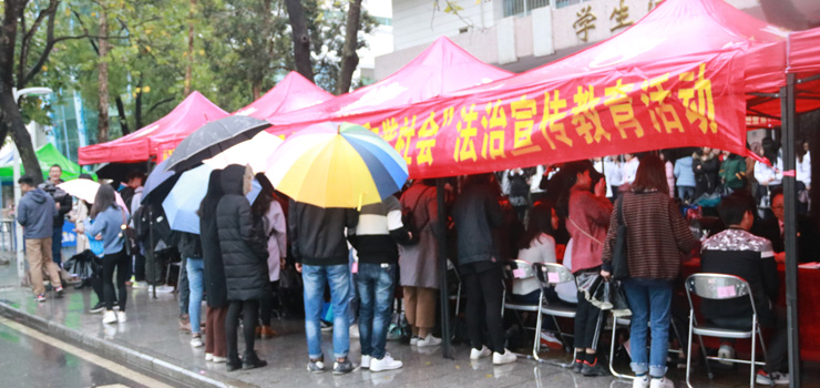 活动在主校道设立了现场法律咨询点,在细密的雨丝中,法律工作者们冒雨为前来咨询的大学生解读相关法治知识,解答相关法律问题,增强大学生的法治意识,提高法治能力。