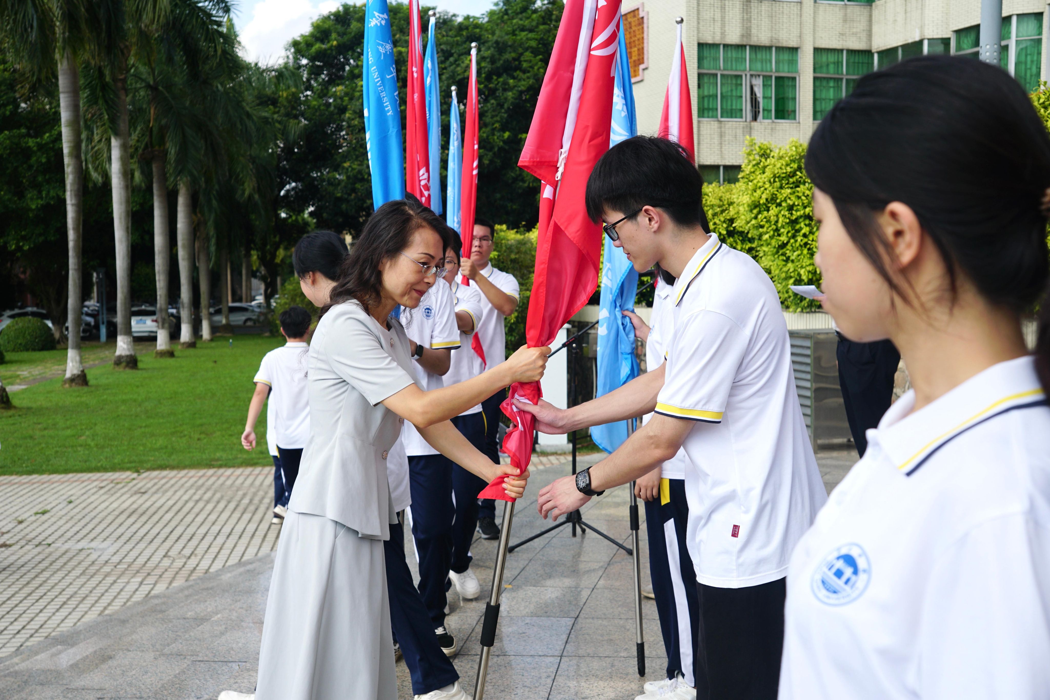 李琴为实习队伍授旗,队员领旗挥旗,向学校表明圆满完成教育实习任务的信心和决心。