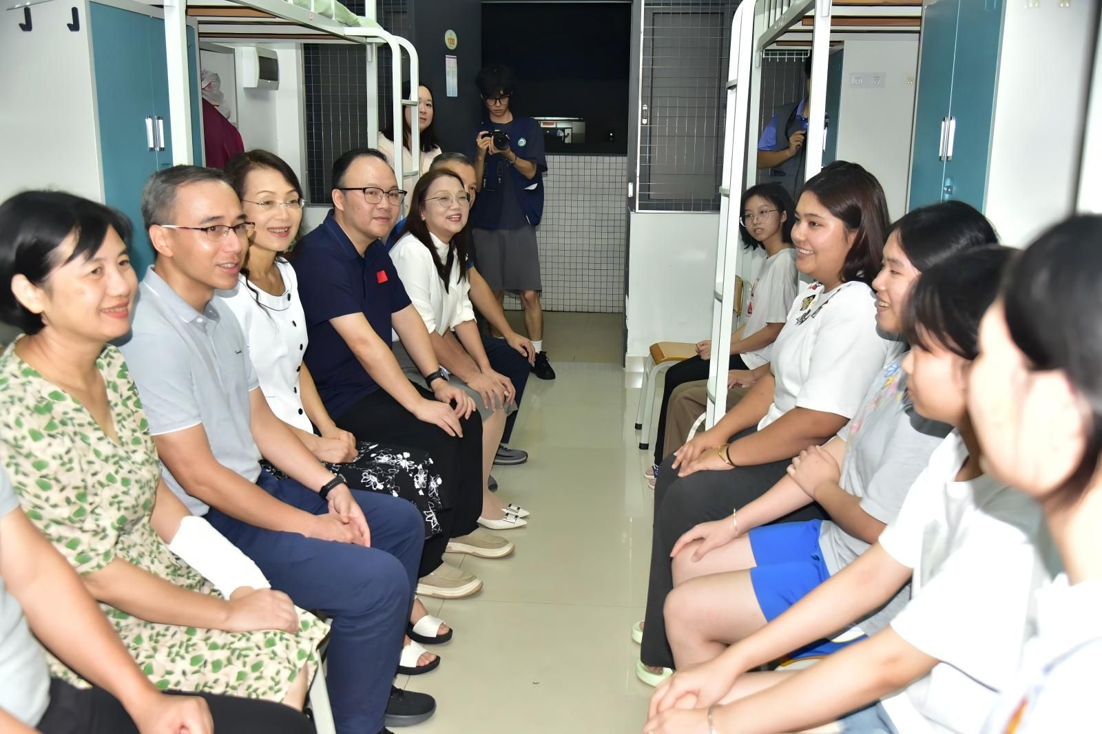 李琴一行先后走访厚德书院、紫荆书院、榕华书院及星湖校区兰蕙书院等新生宿舍区域,细致检查宿舍设施配备、卫生及安全情况,与新生围坐交流,了解他们入学后的生活感受和实际困难,并现场回应解答、协调相关诉求。李琴强调,新生要合理规划大学四年时光,在日常生活与学习中拓宽视野、增长才干,全面提升个人综合素养。她勉励新生珍惜光阴、钻研学问、强健体魄,力争实现德智体美劳全面发展。