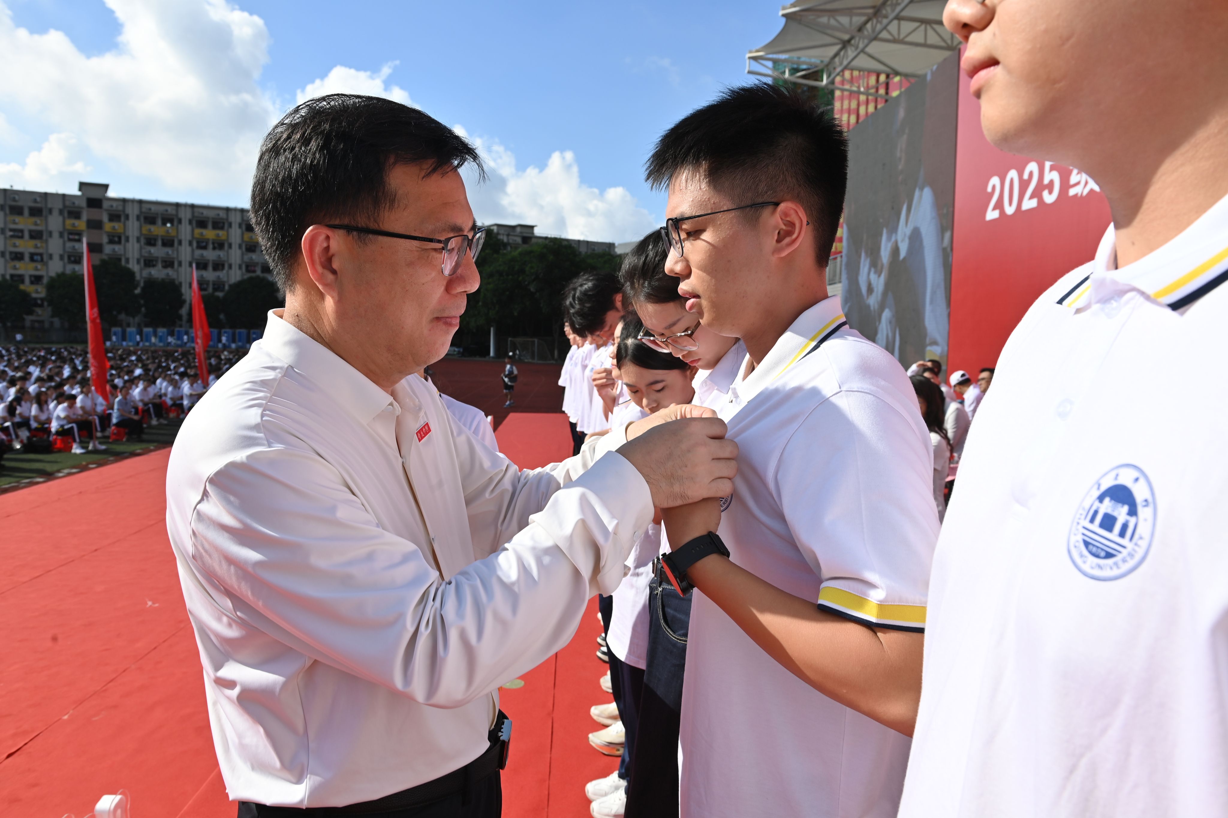 谢冠华为新生代表佩戴学校徽章。这枚熠熠生辉的徽章是肇庆学院学子们的身份象征,更是一份沉甸甸的责任与期许。他期望新一届砚园人传承“厚德、明智、博学、力行”的校训精神,延续有理想、有情怀、有温度、求卓越的砚园品格,在新时代新征程中勇担重任、续写辉煌。