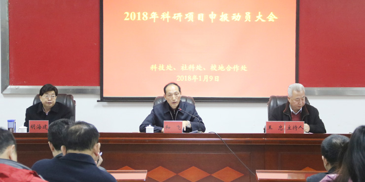 本网讯 1月9日,我校举行科研项目申报动员大会,总结过去一年科研工作,部署新一年的科研任务,为新一轮“申硕工程”做好准备。校长和飞出席并作讲话,副校长王忠主持。社科处、科技处、校地合作处及各二级学院和部门相关负责人、科研人员参加。