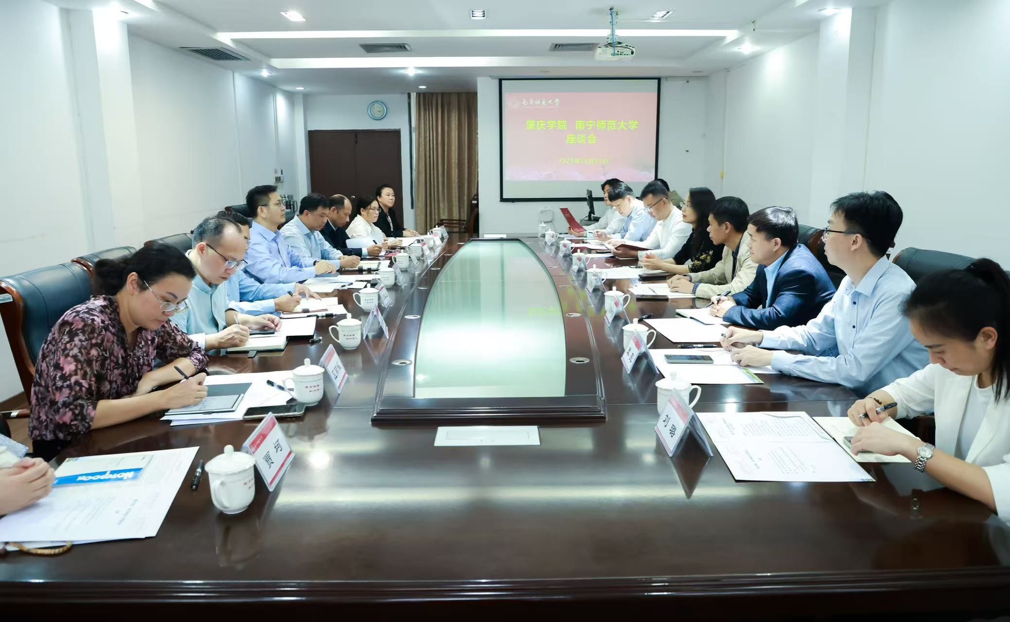 在南宁师范大学,校长隆广庆系统介绍了“改大申博”经验及“错位发展、特色强校”战略。通过主动避开与综合性大学的学科重叠,聚焦“基础教育、职业教育”两大特色,依托“中国—东盟职业教育研究中心”“广西职业教育发展研究中心”,打造了特色鲜明的师范教育科生态;同时以“申博”为支点,集中资源培育优势学科、打造人才团队。李琴表示,两校同属地方应用型高校,均面临“资源有限、竞争激烈”的共性挑战,错位发展不是简单的差异化,而是基于自身禀赋的精准定位,期待通过深化与粤港澳大湾区及粤桂合作示范区高校的合作,构建“资源共享-人才互聘-科研联动”协同机制。