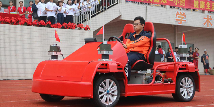 机械与汽车工程学院代表队携着自主研发的红色赛车进场,飘移、旋转等技巧演示瞬间点燃了全场气氛,这可是我校田径场上首次出现小赛车!