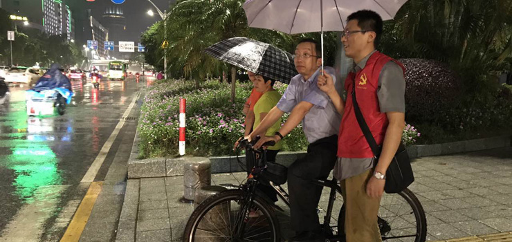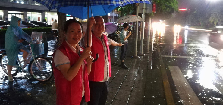在我市创建“全国文明城市”进入最后倒计时的关键时刻,我校师生热情参与志愿服务,积极配合全市创文攻坚,很有风雨无阻的气派和风采。5月23日晚,根据学校参加全市创文志愿服务的统一安排,多名学工干部来到肇庆城区的一个主干道路口进行文明交通引导。当其时,一场大雨不约而至,以至于路上的车辆一律放缓了行速,路上的行人大多选择了避雨。但是,我们的学工干部冒着密密麻麻的雨水,一直坚守在自己的岗位上,为穿梭的车辆、往来的行人提供暖心的引导服务。其情其景,真的感人肺腑。