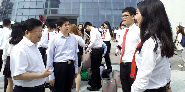 在走访校园期间,吴华钦与师生进行即兴交流,充分感受师生与广大市民一道推进创文的精神面貌。适逢政法学院毕业生在艺术大楼广场拍毕业照,吴华钦愉快地与同学们进行交流,鼓励毕业学子发挥所学专长,在繁荣我市经济社会和文化建设的进程中勇立新功。
