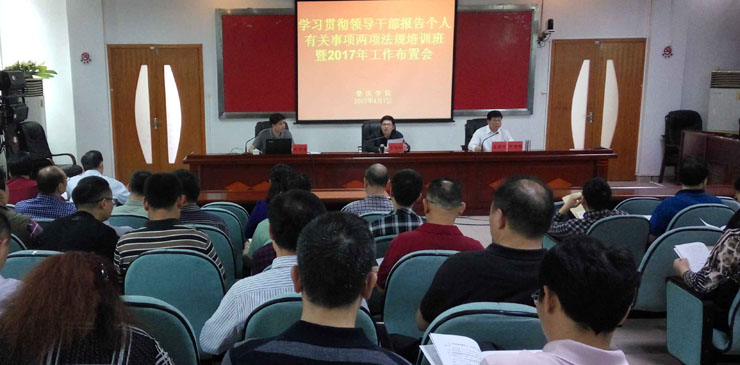 本网讯 4月7日,我校举办学习贯彻领导干部报告个人有关事项两项法规专题培训班暨2017年工作布置会。校党委书记曾桓松出席会议并作讲话,校党委副书记叶峥嵘主持。全校党政管理部门、工会、团委及二级党组织负责人,副处级以上干部参加专题培训。