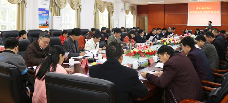 包括韶关学院、广东松山职业技术学院、肇庆医学高等专科学校、清远职业技术学院、罗定职业技术学院、广东理工学院、广东工商职业学院、广东碧桂园职业学院和我校在内的九所粤北地区高校参加本次调研。省厅思政处处长袁本新主持。校党委书记曾桓松、校党委副书记叶峥嵘以及其他兄弟院校的党委负责人,相关职能部门负责人和教师代表出席座谈。