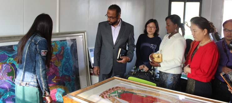 在肇梦空间,客人重点参观了我校“大学生女子工坊”。该工坊由美术学院在校女大学生组建,专门致力于手工艺术品创作。近两年,女子工坊团队所创作的手工艺术品销售到20多个国家和地区,获得国内、国际百余奖项,申请专利和知识产权100余个。诸多作品被国内外机构、政府部门和企业收藏。