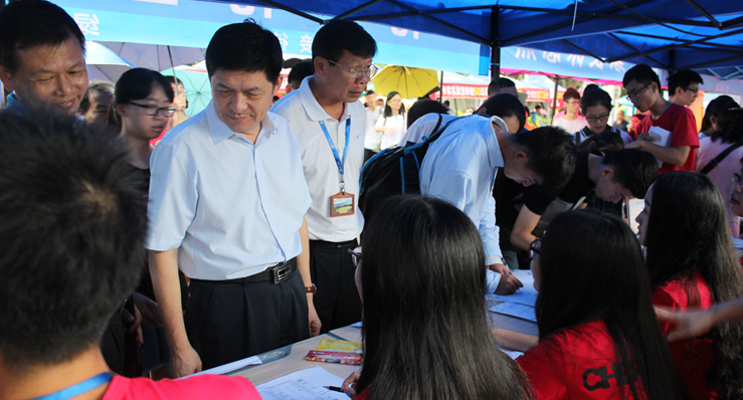 10号上午,校党委书记曾桓松、校党委副书记叶峥嵘来到海容路迎新现场,看望现场工作人员,了解报到实况。他们来到各二级学院“大本营”处,询问已报到的新生数量和工作的进展情况,并询问少数民族地区学生的报到情况,嘱咐相关人员应时刻全面跟进新生的情况,并做好校园交通疏散工作,使迎新工作有序地进行。虽然报到现场下着绵绵细雨,工作人员的热情丝毫不减。